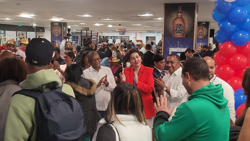 Algunos miembros del Gabinete de Turismo, acompañan a Monika Infante, CEO de AERODOM, a recibir pasajeros que arriban por el AILA-JFPG.